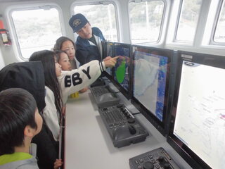 11月7日(木)に能生漁港に停泊している海洋高校の実習船の見学に行きました。 実習船の役割や船での仕事、機械の仕組み、船上での生活について調べました。 船の生活空間は、まるでホテルのようにきれいでした。運航するための操作室は、レーダーやコンピュータの画面がたくさんあり、大きな地図もありました。エンジンの大きさに驚きました。 乗組員や実習の先生方に優しく親切に教えていただきました。ありがとうございました。