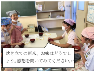普段と違う炊きあがりに戸惑ってしまった子もいましたが、上越、新潟県のコシヒカリのおいしさを感じることのできた活動になりました。 最近、残食の量も減ってきています。とても嬉しく思います。引き続き、学校でも食べ物の大切さを伝えていきますが、ご家庭でも成長期の体づくりに合った食べ方ができるように声掛をよろしくお願いします。