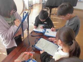 始めは、物が震えている様子を子供らしい言葉で表現していました。 「手をそおっとおくと、こちょばしい。」 「ビーズが動いている。踊っている、はねている。」 「弦が揺れている、ぼよーんとなっている。」などなど