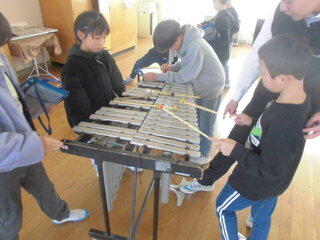 11月21日(金)の3時間目に、音楽室で理科をしました。 鉄琴、小太鼓、バイオリン、琴を使い、音が出ているとき、出ていないときの楽器の手触り、目で見た違い、楽器に載せたプリンカップのビーズの動きを観察しました。 観察する時間をたっぷりとれたので、全員が全ての楽器を鳴らし、十分に観察することができました。 音が出ている物は、やっぱり震えていましたね。