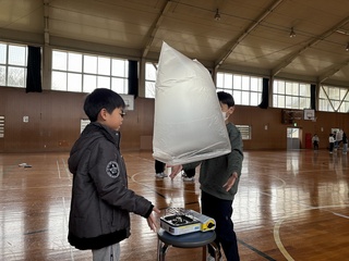 4名程度の班で協力して実験しました。合言葉は「ご安全に」です。 コンロの着火・消火係、タイム計測係、袋の空気を温める係など、浮き上がってから床につくまでのタイムも計測しました。 上手に出来た班は、体育館の天井まで届き、浮上から下降まで44秒も浮いていました。 班のみんなで声を掛け合い、何度も挑戦しました。