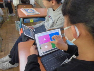 12月16日(火)の2時間目。サンタの赤い帽子をかぶったALTと英語専科の先生がタブレットを使った学習をしていました。 もうすぐクリスマスです。クリスマスにまつわる事柄を今までに学習したフレーズを使ったクイズで紹介していました。 タブレットにあるアプリで、2~4択で答えを求めます。 速く回答した子供からポイントが自動的に付与されます。 まるで、テレビのクイズ番組のようです。 正解、不正解に一喜一憂しながら、英語でクリスマスの事柄を理解していました。