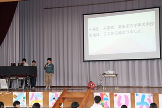 各学年のお祝いは、 1年生:色紙の贈呈 2年生:色紙入れの袋の飾り付け 3年生:体育館入口の飾り付け 4年生:ステージの飾り付け 5年生は、会全体の企画運営進行 心のこもったすばらしいお祝い、プレゼントです。 会の中で、5年生が考えた全校でのゲームや6年生の思い出のアルバム投影がありました。 中でも、6年生が入場するシーンでは、一人一人の活躍やよさを5年生が紹介しました。