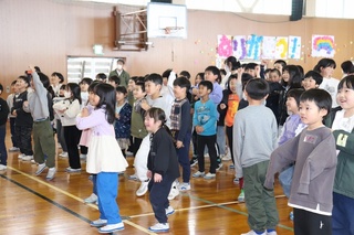 6年生からは会のお礼に「ジャンボリーミッキー」のダンスを披露しました。1から5年生も一緒に踊り始めました。 5年生の皆さん、本当にありがとうございました。 今度は5年生の番です。よろしくお願いいたします。