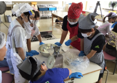 10月9日(木)に、海洋高校の先生と生徒さん4名と一緒に魚醤づくり体験を行いました。海洋高校の先生から、「鮭の皮や骨、ヒレなどを余すことなく使える方法はないかと考え、この最後の一滴にたどり着いた」というお話をしていただき、子どもたちは「皮がある!」「骨も肉も混じってる!」と実物の材料を見ながら学びました。